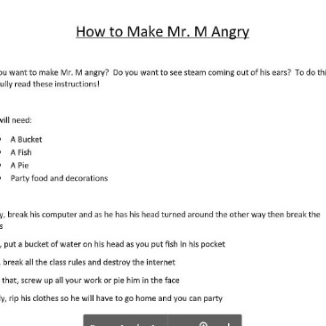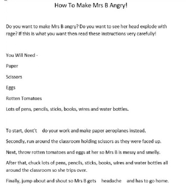 Extension: Use the techniques that you learned this week to create a piece of instruction writing for how to make someone in your family angry.