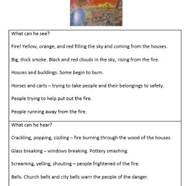 We have made a list of your ideas about what Toby could see, hear or smell when he looked down over the burning city of London. Please watch Mr M’s learning video in which he explains how to use prepositional phrases, verb phrases and noun phrases to help create sentences which explain what Toby could see, hear and smell.