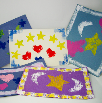 TOP TIP: Instead of dabbing the stamps into paint, brush paint directly onto your sponge stamp. You can paint different parts of the stamp with different colours! This is a good technique to use when making a small number of impressions with your stamp, or when using multiple colours on one stamp.