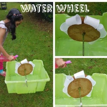 Steadily pour the water from a jug into the top cup of the water wheel and watch it begin to rotate as the water flows. Count how many rotations the wheel makes using 1 litre of water?