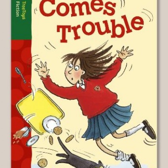 Phoebe read, 'Here comes trouble' on Oxford Owl.