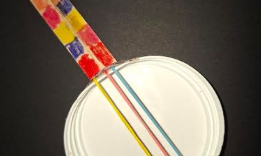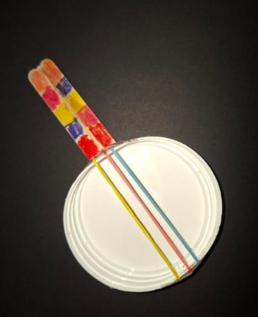 The main body is a round plastic lid, which acts as the soundboard. Three rubber bands (yellow, red, and blue) are stretched tightly across the lid. These function as the strings. Wooden craft sticks are attached at one end and forming a handle.