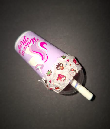 The main body is made using a small plastic cup. The cup and its cover secured with decorative tape, sealing the contents inside. Inside the container has beads that create sound. A short tube is attached as a handle, making it easy to hold and shake.