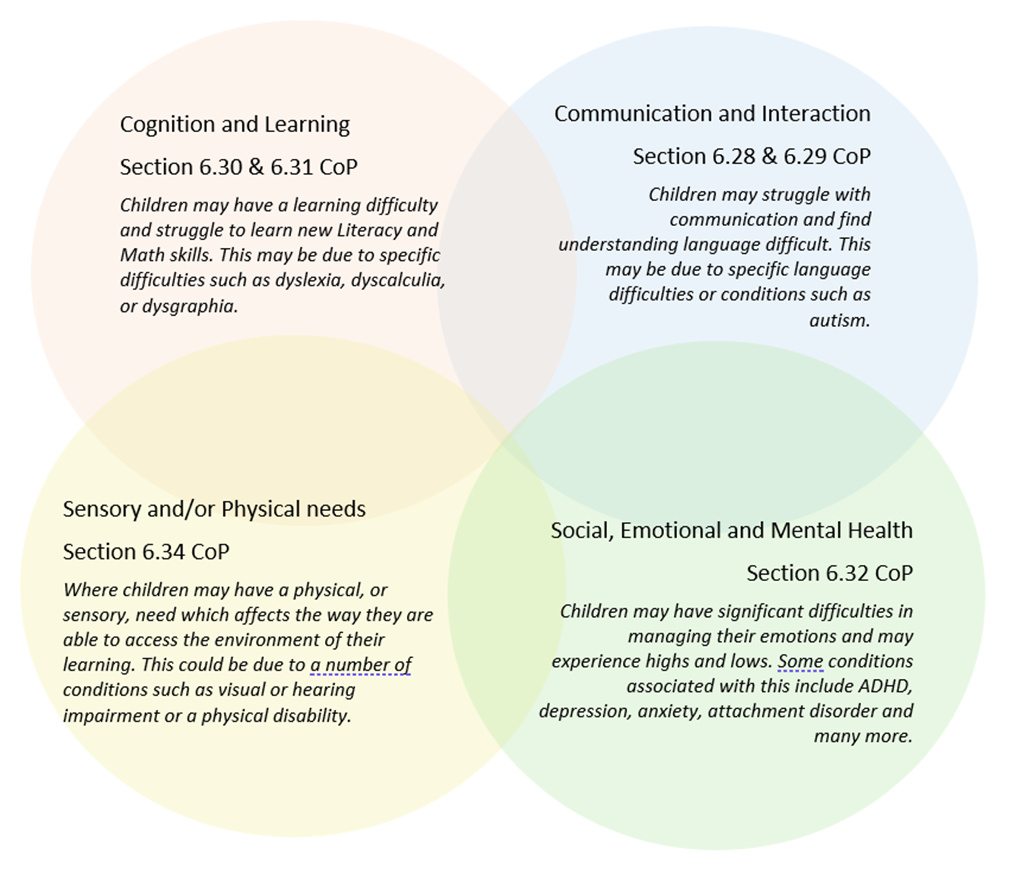 More information about the Areas of Need can be found in the Special educational needs and disability code of practice: 0 to 25 years (link below).