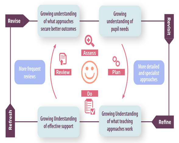 - Graduated approach – an approach to providing SEND support in which the school provides support in successive cycles of assessing the pupil’s needs, planning the provision, implementing the plan, and reviewing the impact of the action on the pupil